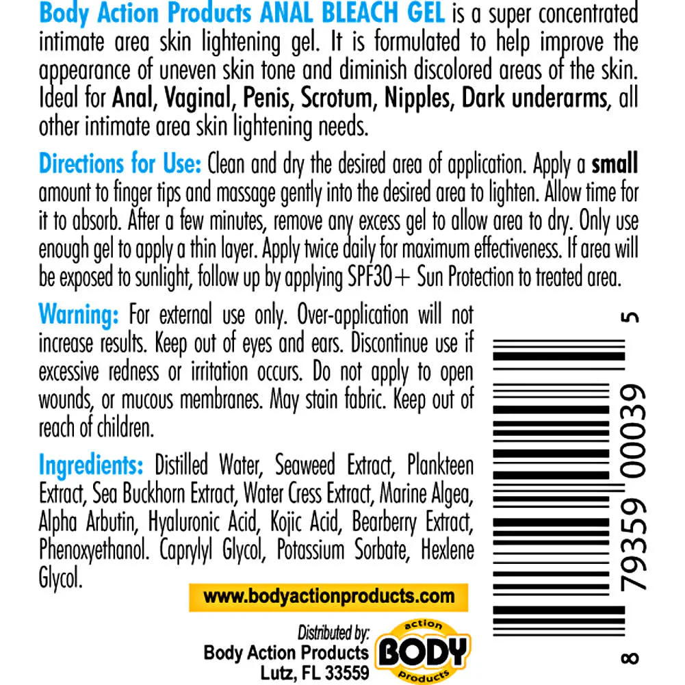 Body Action Anal Bleach Gel is a topical, water-based, super-strength formula containing a blend of seaweed and plankton extracts that combine with hyaluronic acid to provide the bleaching effect that will not cause burning or irritation when used no more than twice a day (as directed).